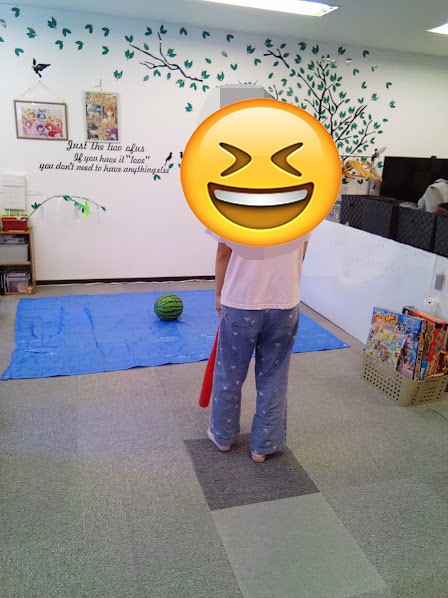 最近あまりにも暑すぎるので、「何かしたいな~」とみんなで相談したところ、「スイカが食べたい」という意見が集まりました。そしてスイカ割りをしたことがないというお子様もいらっしゃったので、「みんなでスイカ割りをしよう!」と計画されました。