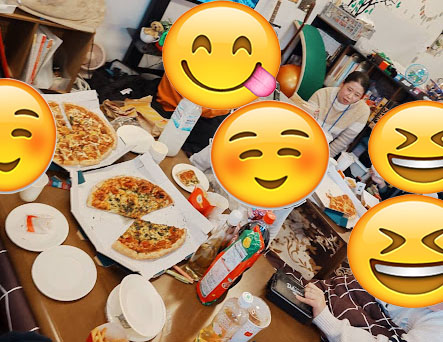 ジュース・シャンメリー・こどもビールで乾杯して、おしゃべりを楽しみながら食事をしました。ハンバーガーなどを食べながら、足りない分はユアスペースのお弁当やピザを召し上がられています。