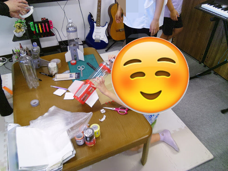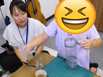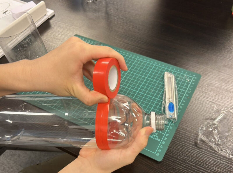 ペットボトルをカッターやハサミを使って上手に切り、ビニールテープで貼り付けていきます。みなさん手先が器用で、上手に工作されていました。