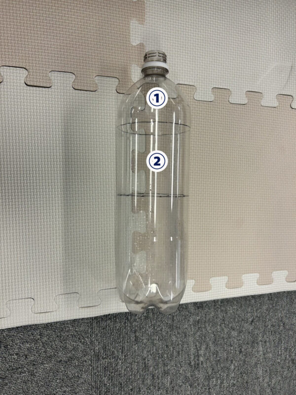 2.先ほど切った①の部分を、もう一本のペットボトルの底にビニールテープで付けます。そして➁の部分は、もう一本のペットボトルの先端にビニールテープでスカートのように固定します。