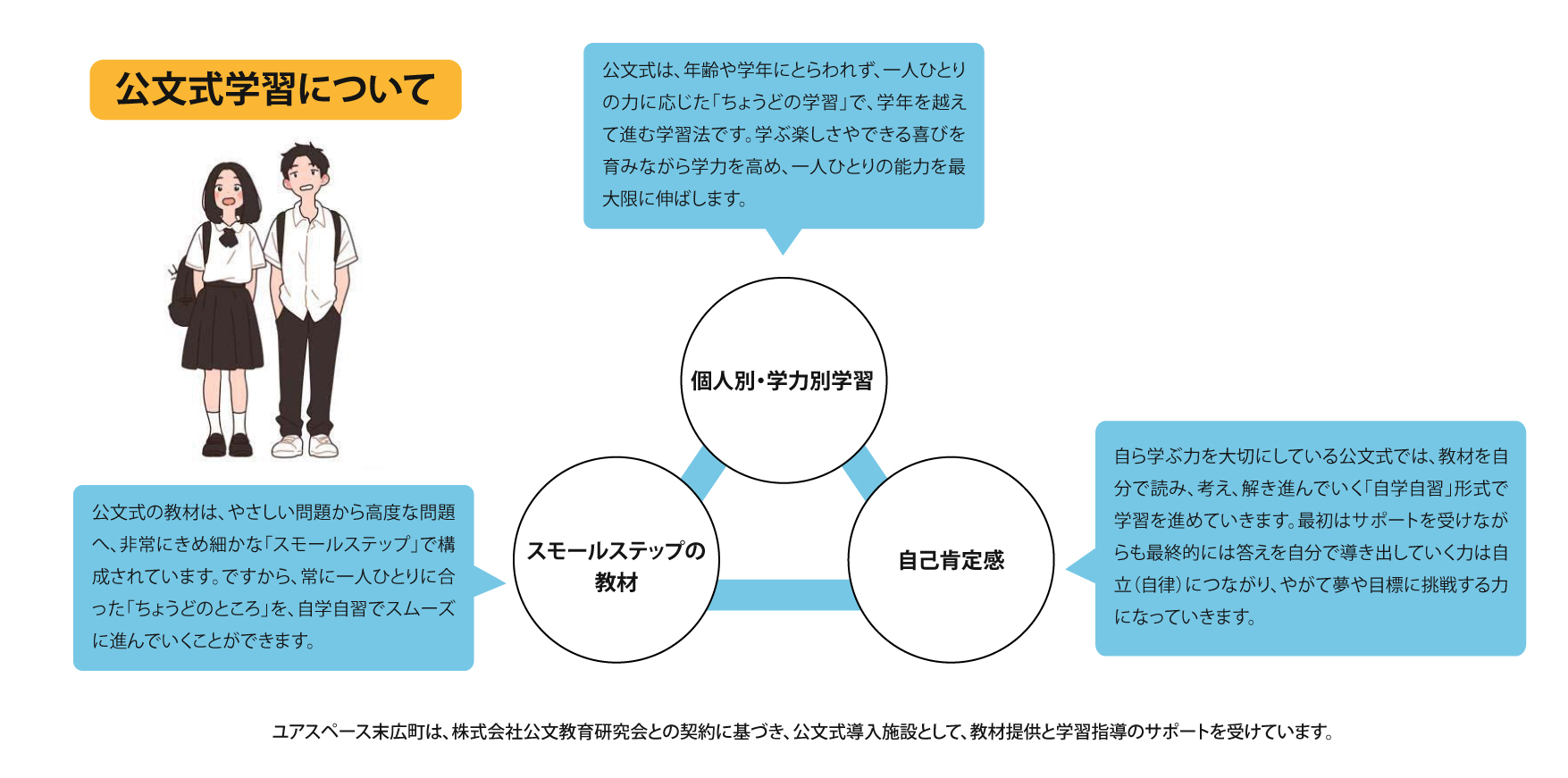 ユアスペース末広町は、株式会社公文教育研究会との契約に基づき、公文式導入施設として、教材提供と学習指導のサポートを受けています。
