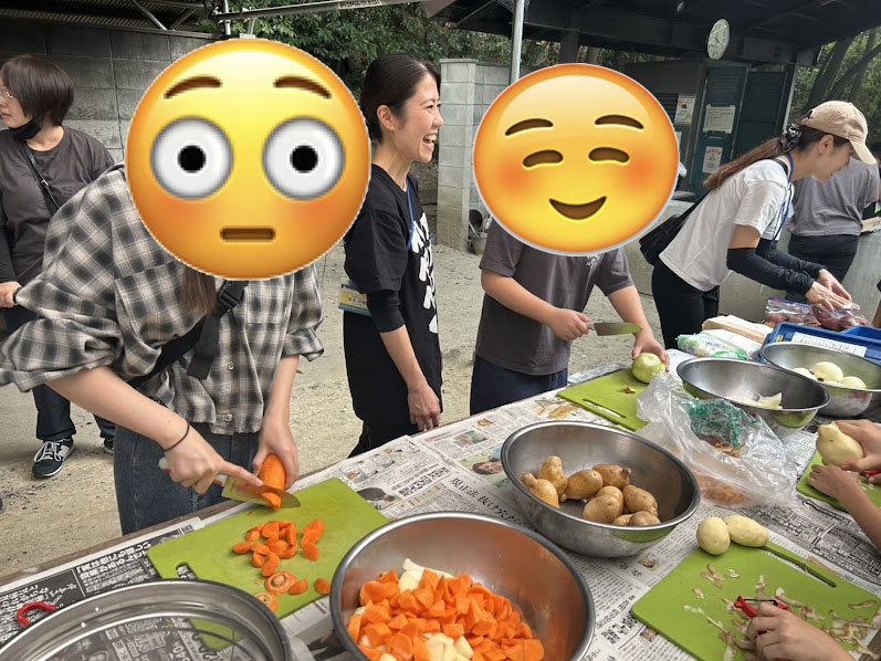 今回利用させて頂いた施設は、「吹田市自然体験交流センターわくわくの郷」という所です。阪急北千里駅から徒歩で10分程の距離です。自然豊かな環境で、空気がとても美味しかったです。どんぐりが上から落ちてくる音を聞きながら、みんなでカレー作りにいそしみました。